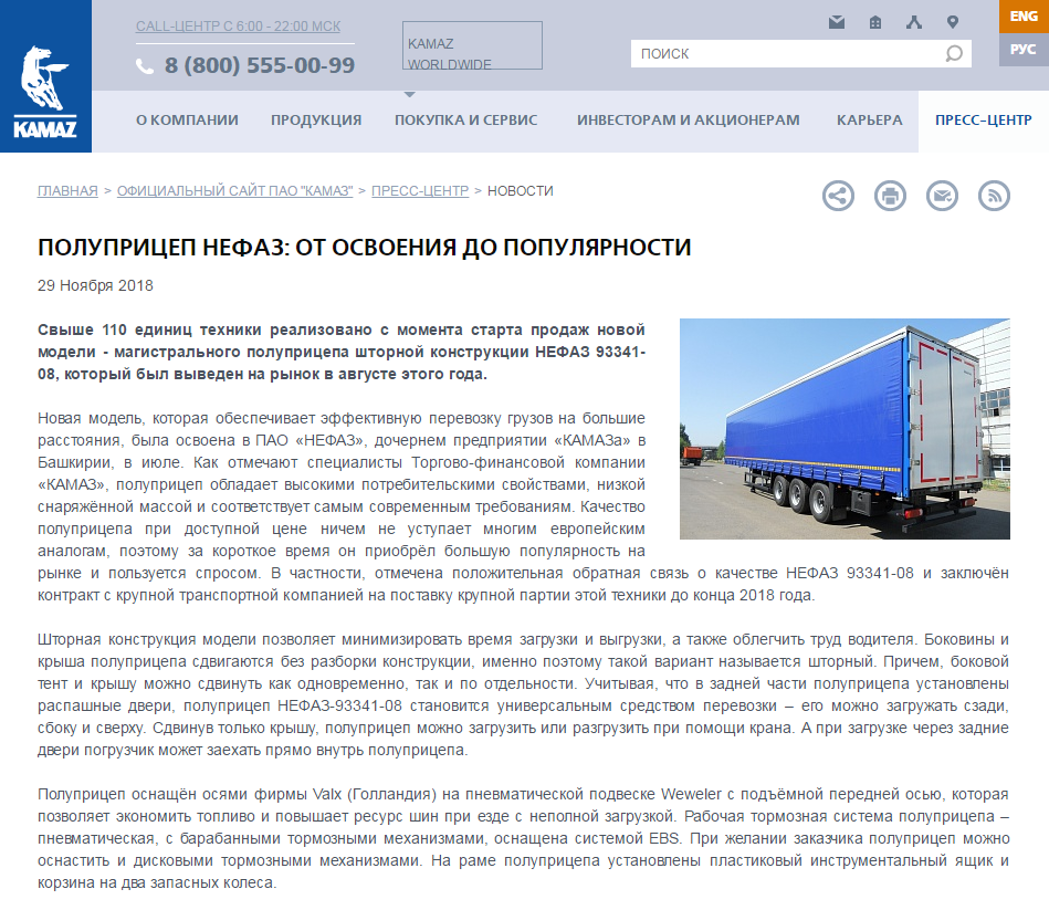 作為側(cè)簾半掛車的新車型,NEFAZ 93341-08自從今年8月份推出市場以來,累計(jì)銷量已經(jīng)超過110臺。