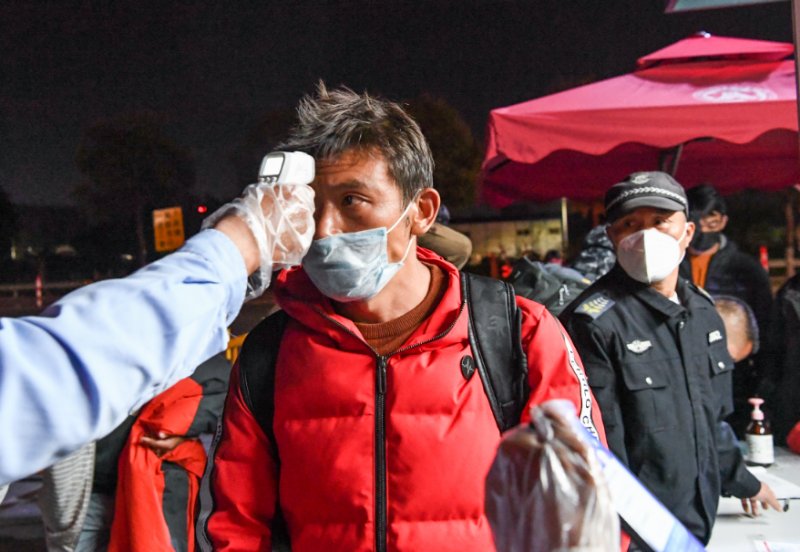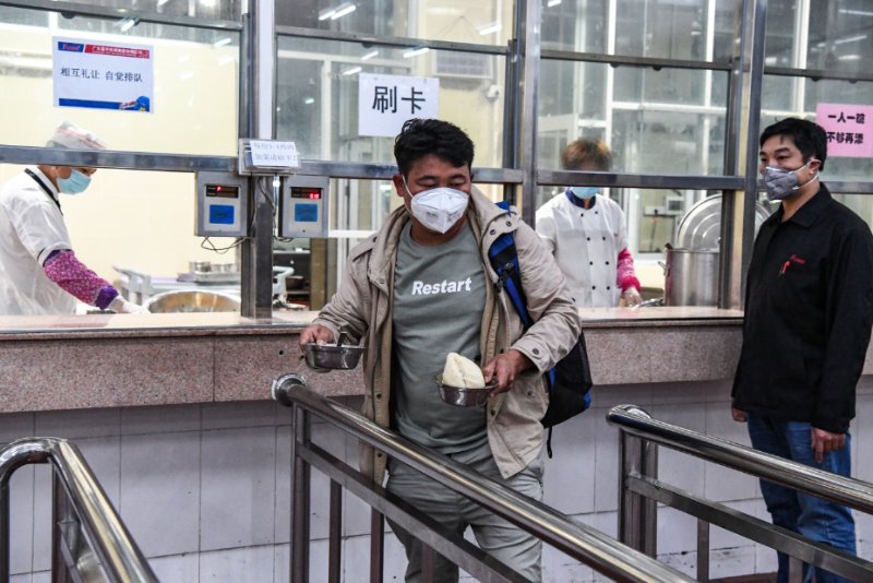 員工們下車集結(jié)之后,防疫工作人員依次為他們測量體溫并進行消毒防護處理,指引員工們有序進食堂就餐,然后回宿舍休息,為第二天安全復(fù)工做好準備。